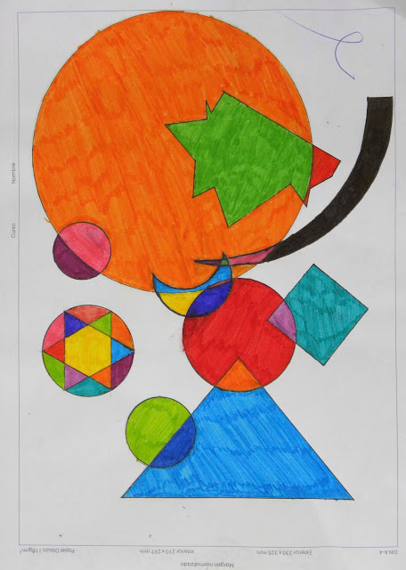 Kandinsky es un maestro de la composición porque consigue armonías y contrastes extraordinarios en los diálogos entre estos elementos. Pero no sólo realiza composiciones medidas y calculadas, sino que también realiza obras abstractas de factura improvisada que son la demostración de que las emociones pueden expresarse mediante estos elementos visuales tan simples. Ahora os enseño algunos de los dibujos de alumnos de 2º de ESO, basados en la pintura de este genial pintor.